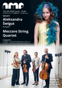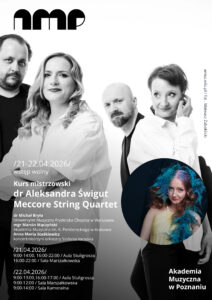 W dniach 21-22 kwietnia 2026 r. w Akademii Muzycznej w Poznaniu odbędą się mistrzowskie kursy indywidualne, które poprowadzą dr Aleksandra Świgut (fortepian, Uniwersytet Muzyczny Fryderyka Chopina w Warszawie) oraz członkowie Meccore String Quartet.