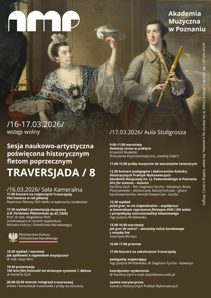 W dniach 16-17 marca 2026 r. zapraszamy do Akademii Muzycznej na sesję naukowo-artystyczną Traverjsada Historyczne flety poprzeczne w teorii i praktyce Harmonogram: 16 marca | Sala Kameralna 17:00 … Czytaj dalej Traversjada. Historyczne flety poprzeczne w teorii i praktyce/17.03.2026