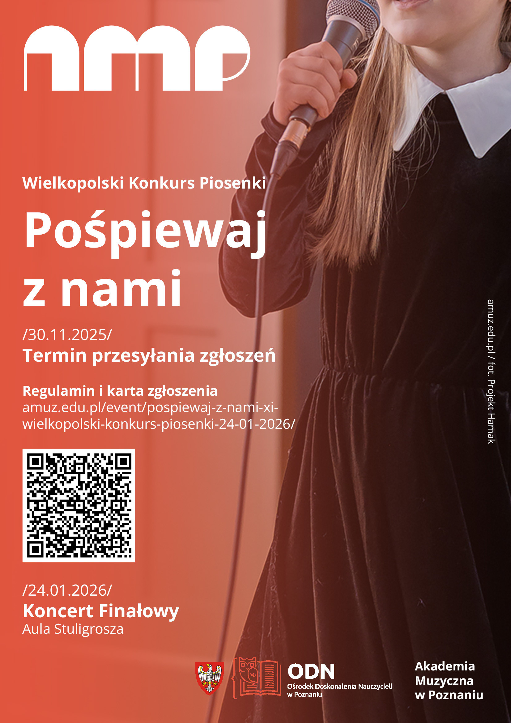 Katedra Edukacji Muzycznej Akademii Muzycznej im. Ignacego Jana Paderewskiego w Poznaniu serdecznie zaprasza dzieci i młodzież do udziału w XI Wielkopolskim Konkursie Piosenki Pośpiewaj z nami organizowanym dla uczniów szkół podstawowych, ponadpodstawowych oraz szkół muzycznych I stopnia (klasy IV–VI) w Poznaniu i Wielkopolsce. Celem Konkursu jest animowanie i promowanie szkolnej działalności muzycznej w regionie, propagowanie […] |