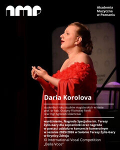 Daria Korolova – studentka I roku studiów magisterskich w klasie prof. dr hab. Grażyny Flicińskiej-Panfil oraz mgr Agnieszki Adamczak zdobyła WYRÓŻNIENIE, NAGRODĘ SPECJALNĄ im. Teresy Żylis-Gary dla sopranistki oraz NAGRODĘ – udział w koncercie kameralnym w sezonie 2025/2026 w Salonie Teresy Żylis-Gary w Krynicy-Zdroju na XI International Vocal Competition „Bella Voce” (Busko-Zdrój, 16-19 sierpnia 2025).