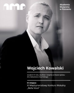 Wojciech Kowalski – student IV roku studiów I stopnia w klasie śpiewu dra Sebastiana Szumskiego zajął III MIEJSCE na XI Międzynarodowym Konkursie Wokalnym ,,Bella Voce” (Busko-Zdrój, Polska 16-19.08.2025). Przy fortepianie Wojciechowi Kowalskiemu towarzyszyła Laura Kluwak-Sobolewska.