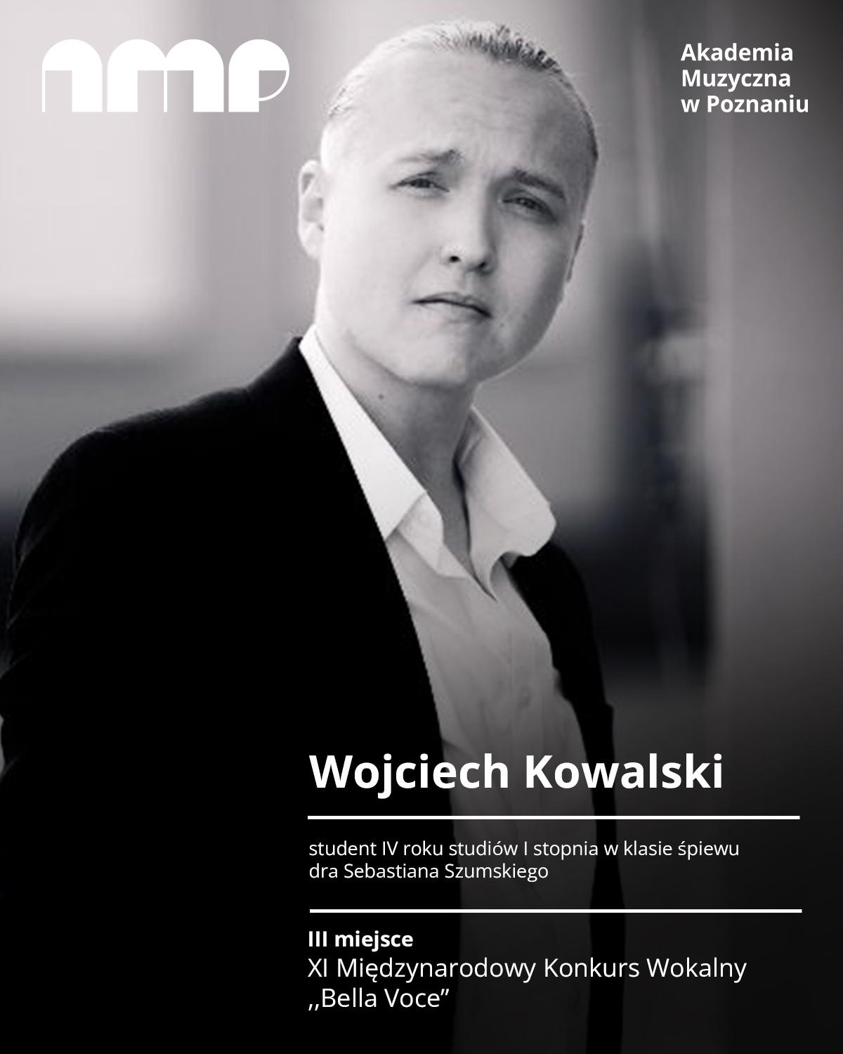 Wojciech Kowalski — student I roku studiów I st. w klasie prof. dra hab. J. Bręka zdobył III NAGRODĘ i WYRÓŻNIENIE za najlepsze wykonanie pieśni Marii Zamoyskiej na I Ogólnopolskim Konkursie Wokalnym im. Marii Zamoyskiej w Kórniku (13-14 V 2023).