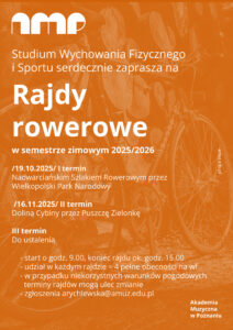 W niedzielę 19 października wybierzemy się Nadwarciańskim Szlakiem Rowerowym przez Wielkopolski Park Narodowy do Puszczykowa. Przerwa planowana jest w Muzeum Arkadego Fiedlera (połączona z krótkim zwiedzaniem ekspozycji). Trasa liczy 46 km. Zbiórka przy głównym wejściu do Akademii, ruszamy o godz. 9.00. Powrót w to samo miejsce ok. godz. 15.00. Studenci I roku studiów licencjackich udziałem w rajdzie zaliczają 4 x 90 minut zajęć z wf.